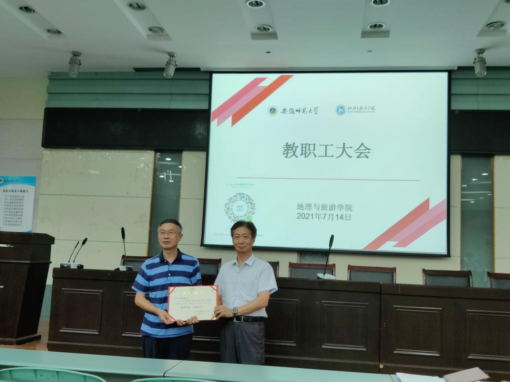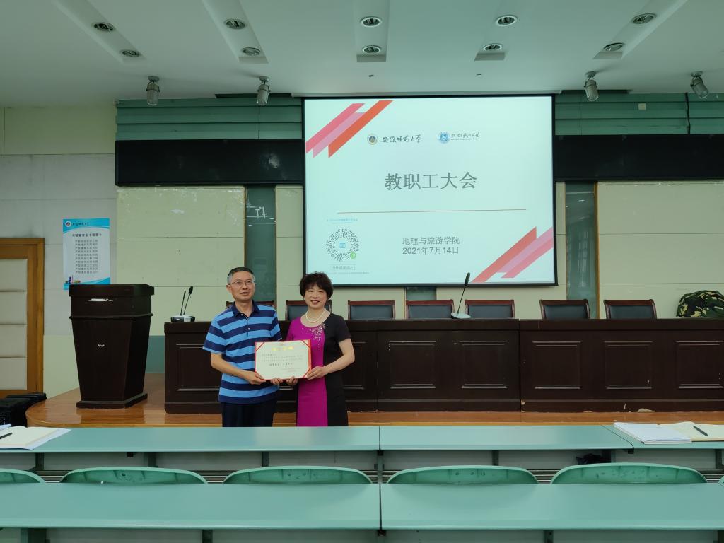本网讯(地旅学院)7月14日下午,学院为表达对退休教师爱岗奉献、辛勤耕耘的致敬与感恩之情,举办了2021年退休教师光荣退休仪式。会上,院党委书记贾冠忠代表全院教职工向凌善金和鲍静两位退休教师表示衷心感谢和崇高敬意,为他们颁发了荣退证书和慰问品。退休教师表达了对学院举办此次退休仪式的感谢,深情回顾了在地旅学院工作的美好时光,对学院快速发展和取得的辉煌成就感到骄傲、自豪,并表示在乐享退休生活的同时,将一如既往地关注学院、学校发展,继续为学院、学校的发展发挥余热。